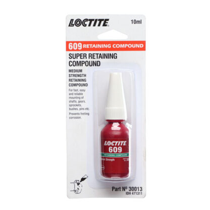 High strength methacrylate ester acrylic retaining compound designed for the bonding of cylindrical fitting parts. LOCTITE® 609 is a green, high strength methacrylate ester acrylic retaining compound designed for the bonding of cylindrical fitting parts. The product cures in the absence of air between close fitting metal surfaces. Typical applications include rotor to shafts in fractional and subfractional horsepower motors. Locks bushings and sleeves in housings on shafts. Augments press fits.