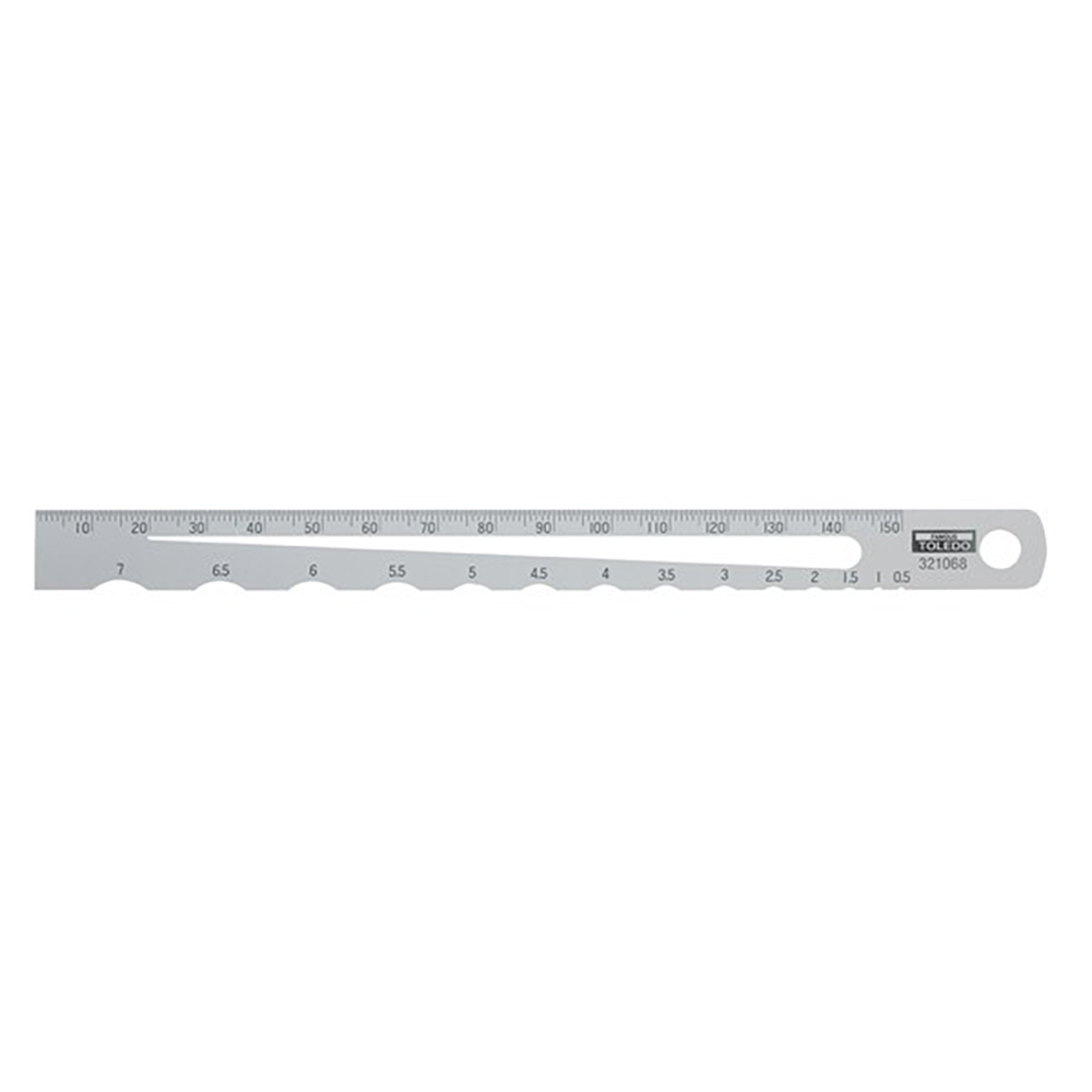 Manufactured in Japan from hardened stainless steel, these scales are built to withstand the rigours of professional use while maintaining exceptional accuracy. The design features precision-cut side indentations for checking radii and a central slot for measuring diameters, alongside a standard 150mm metric rule for linear measurements. Finished with a satin chrome coating to reduce glare and featuring photographically etched markings for superior legibility, the Toledo Radius Scale ensures you get a precise reading every time. Available in two distinct ranges-0.5mm to 7mm and 8mm to 15mm-these scales are an indispensable addition to any precision toolkit.