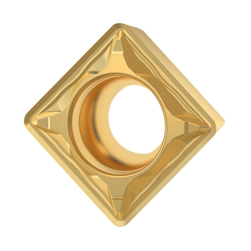 - Finishing geometry with positive rake face for chip control in difficult materials.