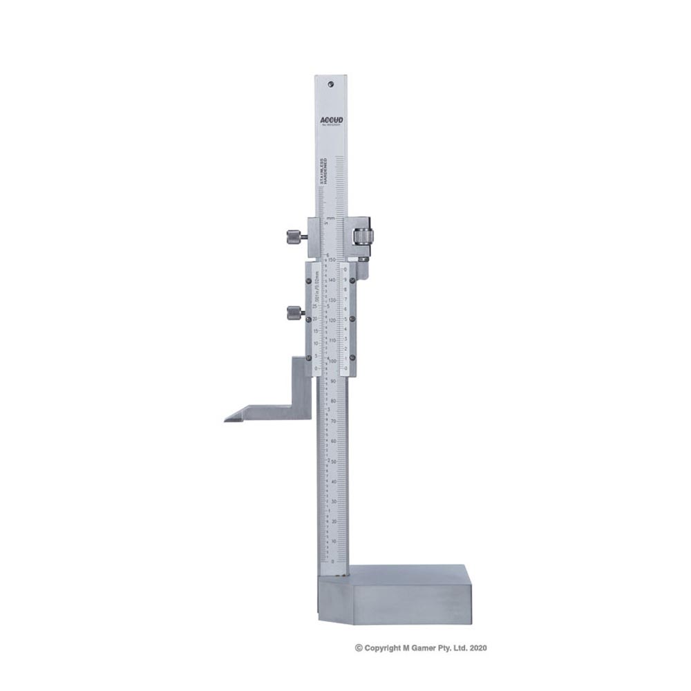 Carbide tipped scriber. Made of stainless steel (except the base). Satin chrome plated scale