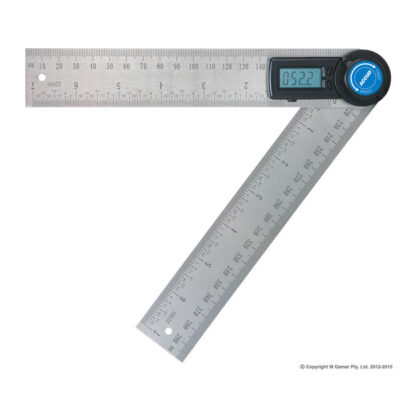 Resolution: 0.1°. Buttons: on/off, zero. Locking attachment. Rule Graduation: 1mm & 1/32″. Auto power off