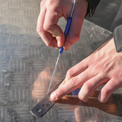 This product is ideal for marking metals and soft materials as a guide prior to cutting. It is made from durable heat treated carbon steel, has an anodised and knurled grip, includes both a straight and 90 degree angled tips and is finished with laser etched branding.