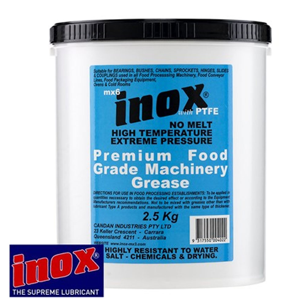 - INOX MX6 is highly suitable for all bearings, bushes, chains, hinges, sprockets, slides, splines & couplings, universals and ball joints used in all Food processing Machinery, Beverage Filling Lines, Food Conveyor Lines, Food Packaging Equipment, Freezers and Cold Rooms
