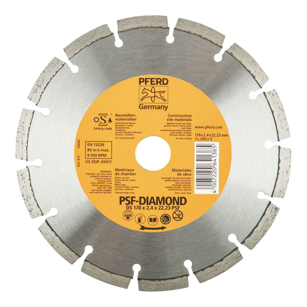 PFERD diamond cut-off wheels are manufactured in compliance with the highest quality and safety standards. Guaranteed optimum cutting results allowing economical work on different types of construction materials: (Concrete, brick, hard stone, granite, marble, asphalt, block and other abrasive building materials.)