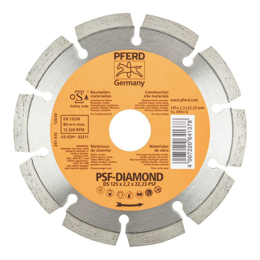 PFERD diamond cut-off wheels are manufactured in compliance with the highest quality and safety standards. Guaranteed optimum cutting results allowing economical work on different types of construction materials: (Concrete, brick, hard stone, granite, marble, asphalt, block and other abrasive building materials.)