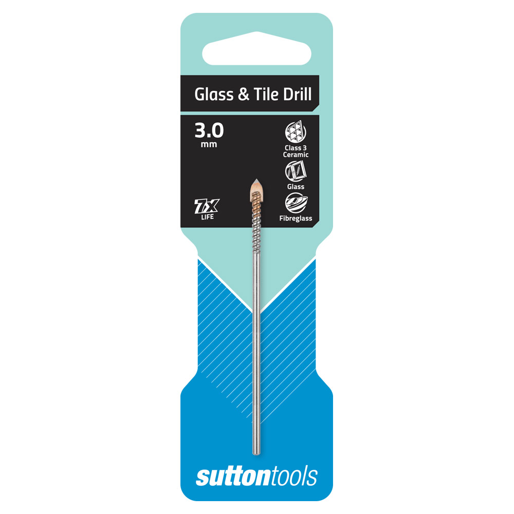 Sutton Tools glass & tile drills are designed for smooth drilling in up to Class 3 ceramic tiles, glass, brick, plastics and fibreglass. The unique design with specialised carbide tip and spiral flutes make these drills last 7 times longer and cut 30% faster than a standard glass & tile bit.
