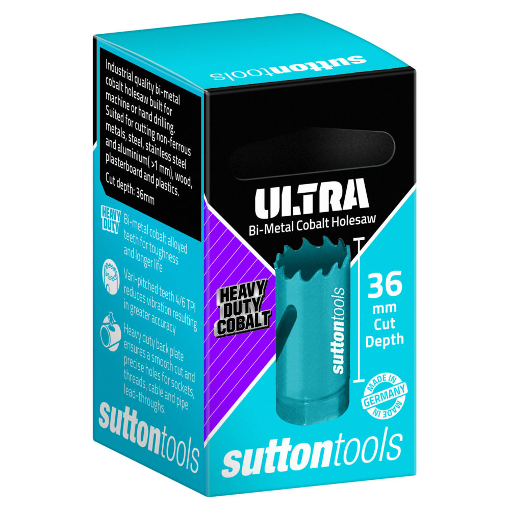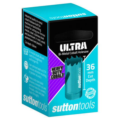 Sutton Tools Ultra Bi-Metal Cobalt Holesaws are an industrial quality holesaw. These holesaws feature premium quality teeth for toughness and long life and are designed for 36mm cutting depth. They can be used for machine or hand drilling and are suited to cut steels, stainless steel, cast iron, non-ferrous materials, plastic and wood.