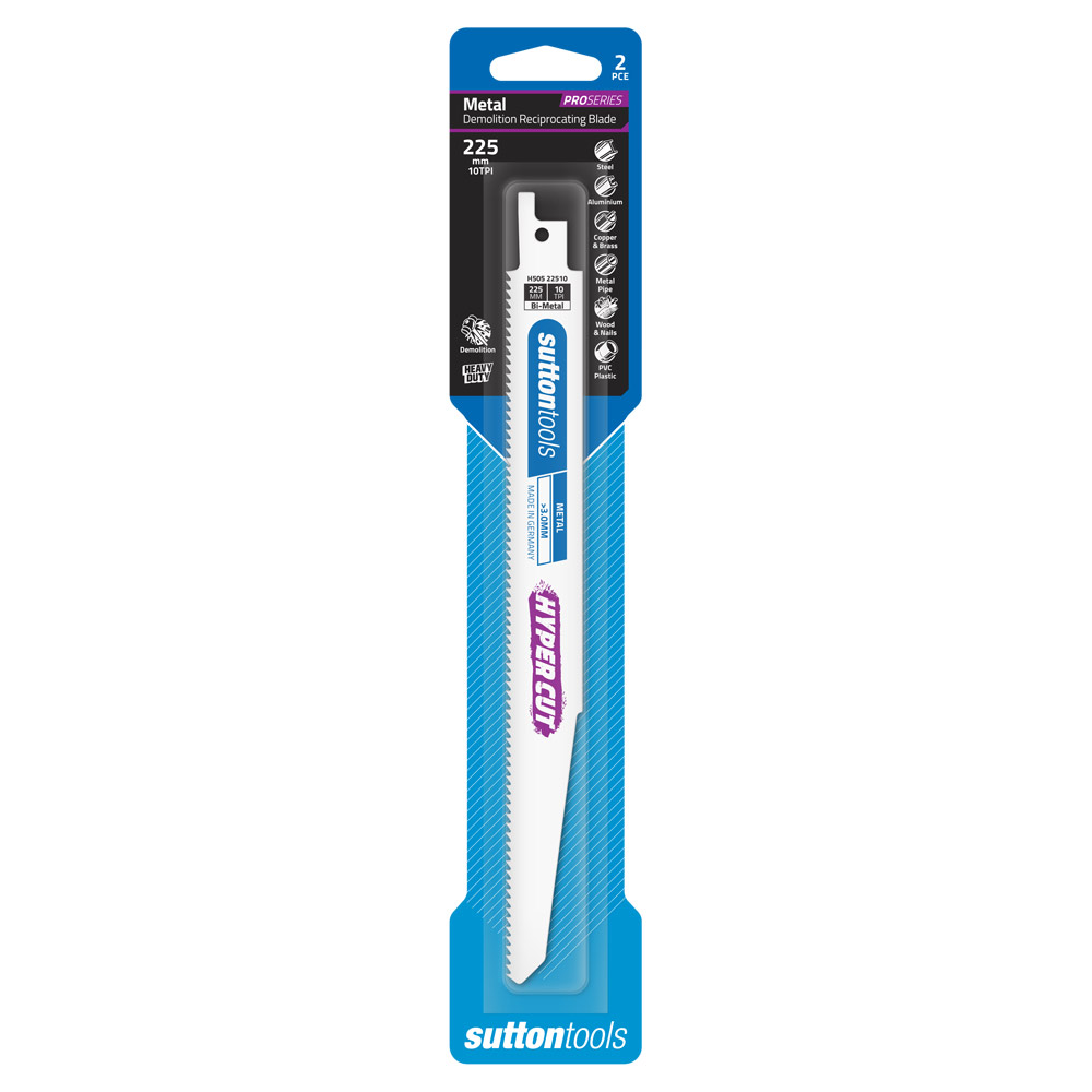Sutton Tools Hypercut reciprocating saw blades are a special thick and robust blade designed for demolition work. Suitable for cutting steel, stainless steel, aluminium, copper, metal pipe (>3.0mm), PVC plastics and wood & nails.